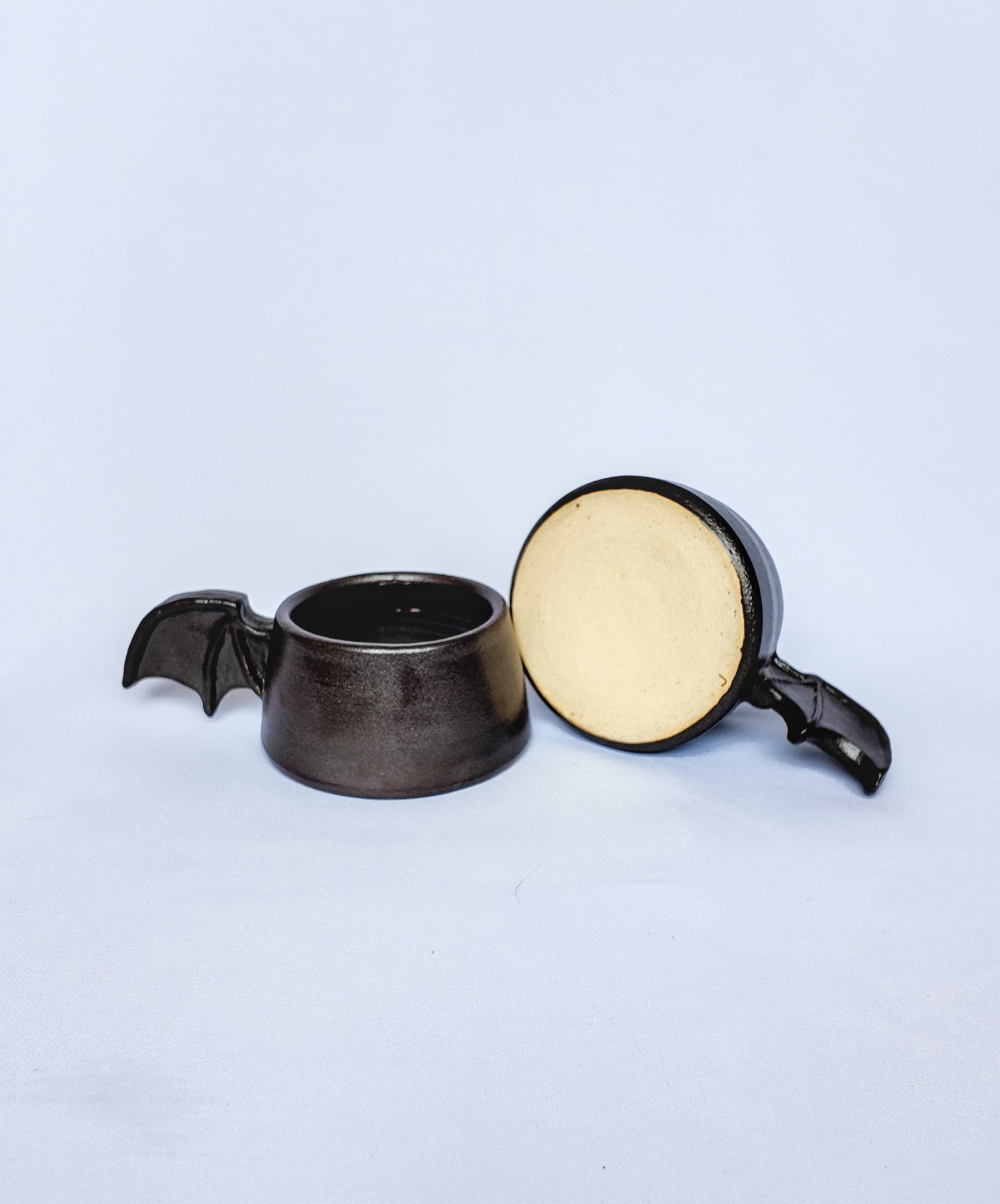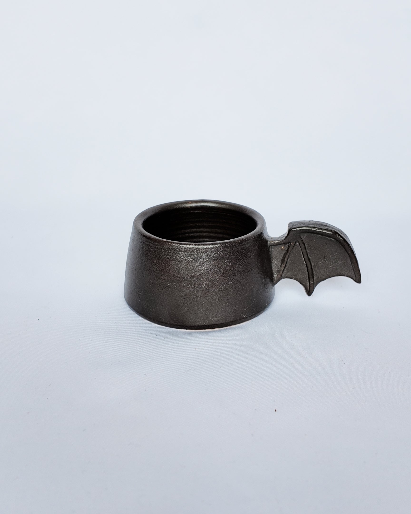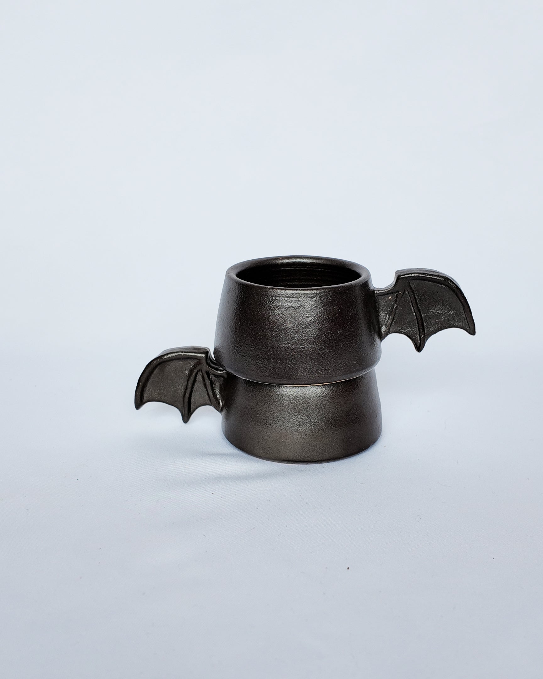 Nothing says goth more than an espresso cup with a bat wing for a handle. These are probably my favorite from the whole collection and for a good reason. Made from a creamy clay with a dark brown matte glaze.