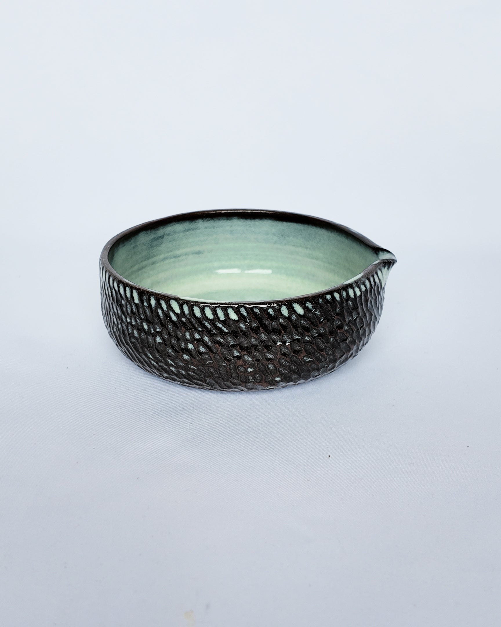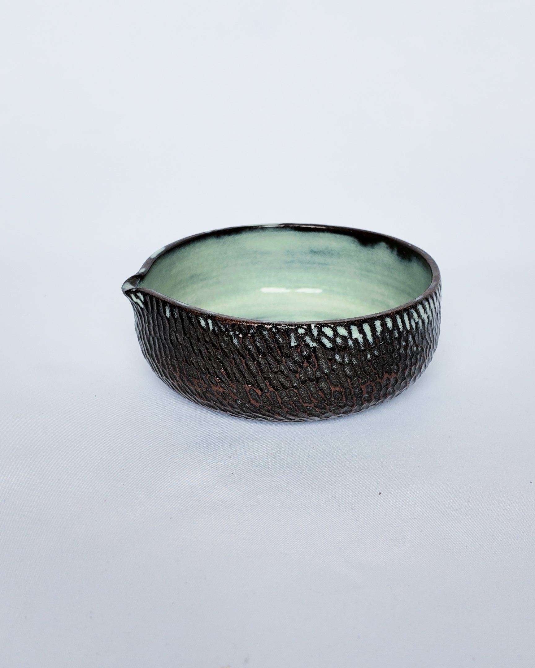 Beautiful matcha bowl with a hand-carved texture. Made from dark brown clay with a white/transparent (depending on the spot) ash glaze.