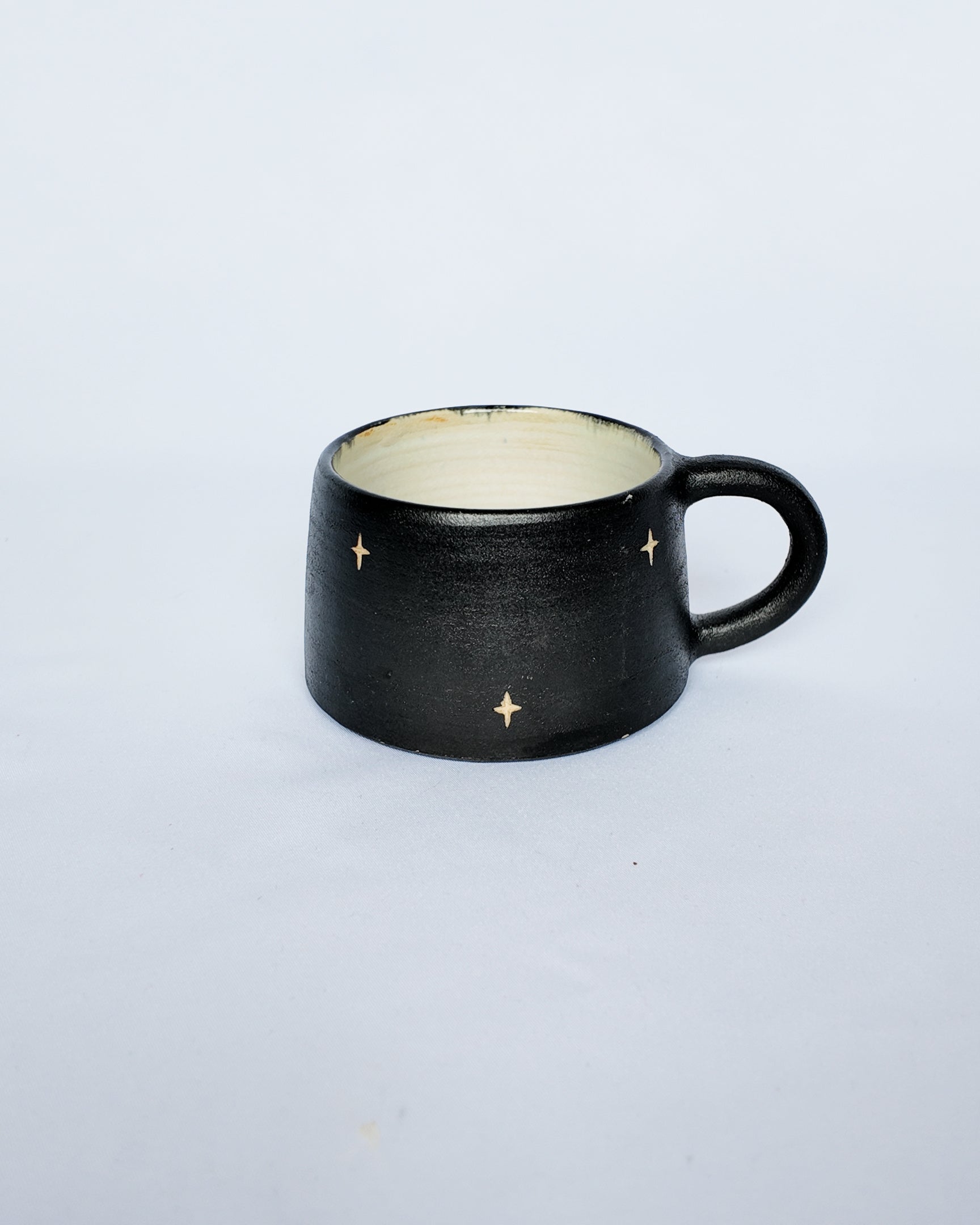 A superb mug with cute tiny little stars. Made with cream-colored clay. White ash glaze on the inside, matte black underglaze on the outside.