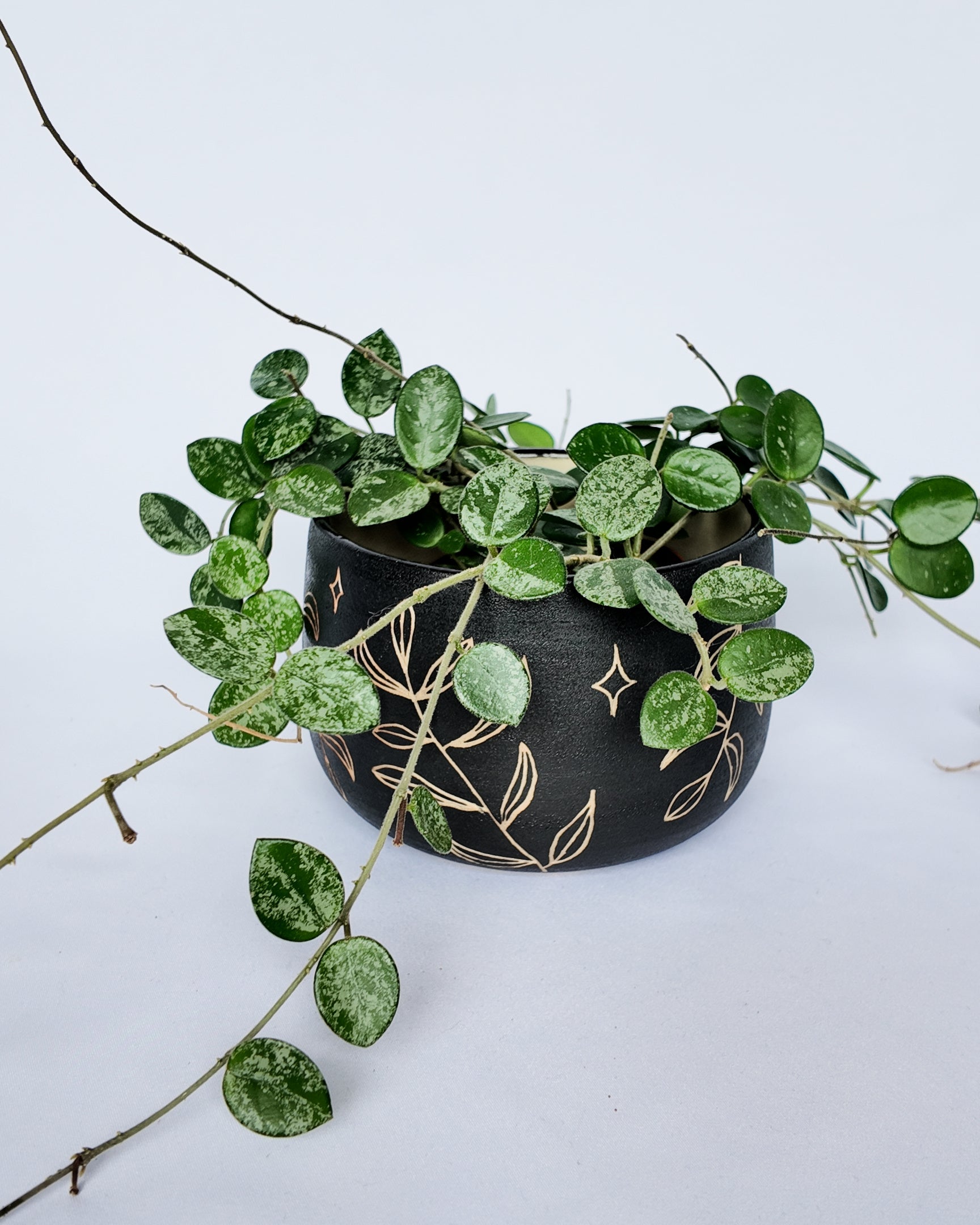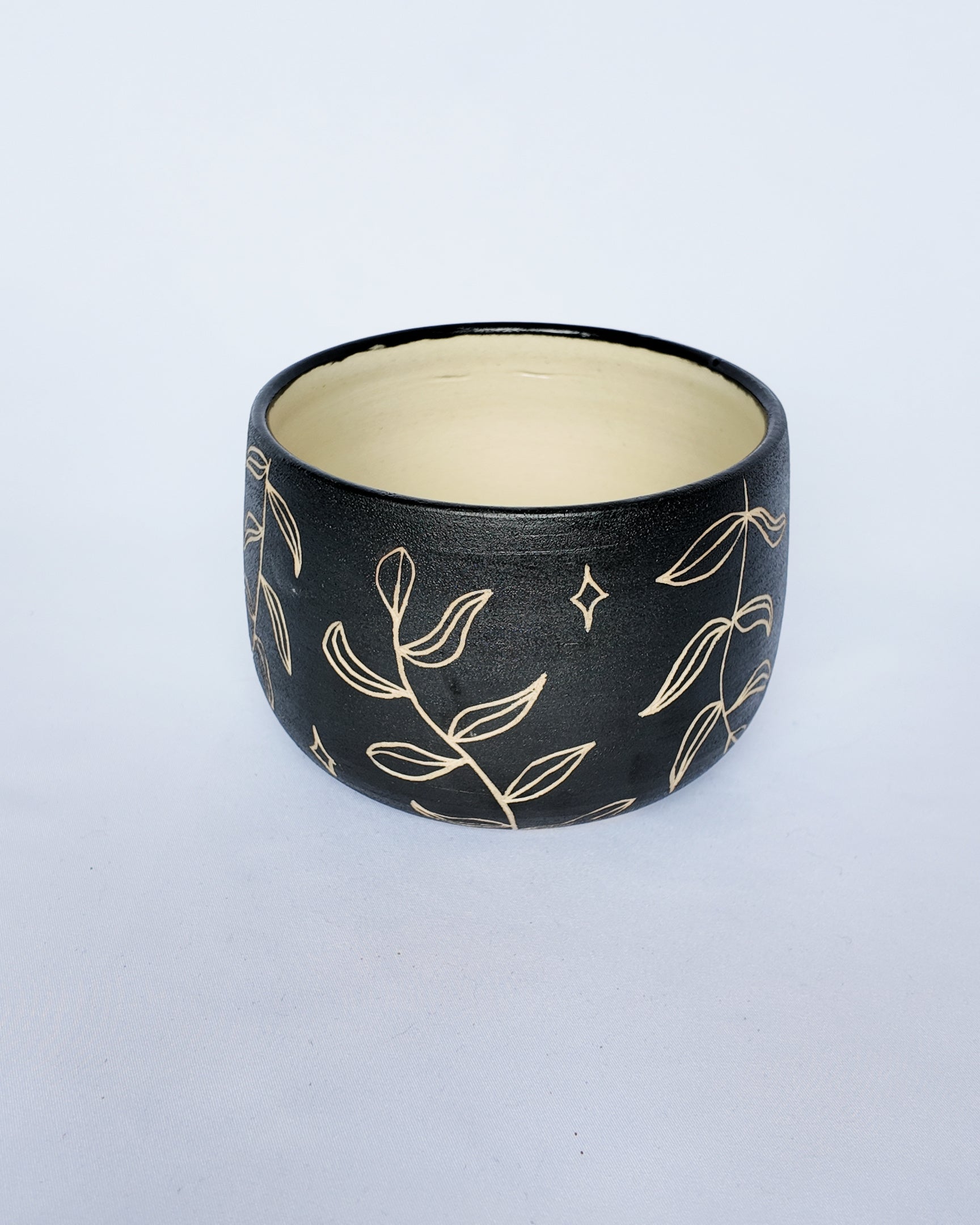 Cute tiny planter with a hand-carved sgraffito leaf design. Suitable for smaller plastic pots (less than 10cm) or planting directly into pot. Made from clear-colored clay, glazed on the inside to retain moisture.